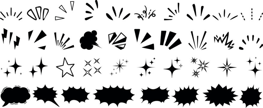 Comic explosion element, star burst, speech bubble, and sparkle icon collection in black silhouette style. Perfect for pop art, retro comics, and cartoon effects in graphic design projects