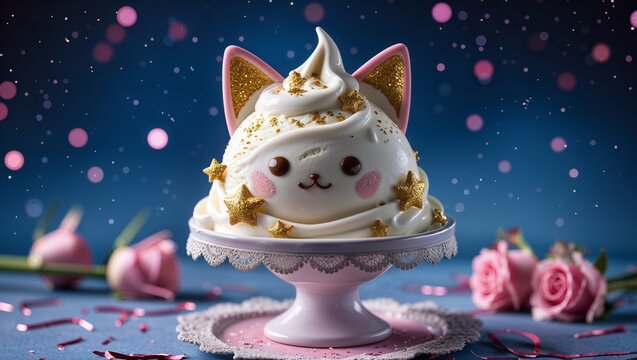 Cute cat shaped cake with golden ears stars sprinkles pink roses blue background