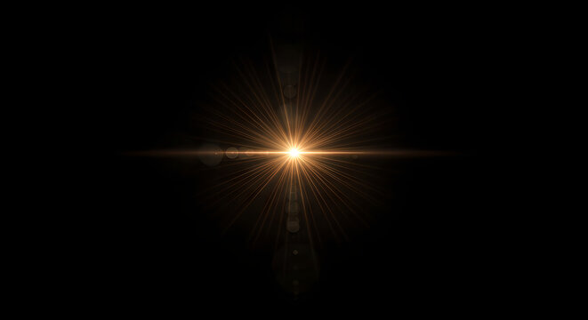 Abstract lens flare effect with bright optical light rays on black background creating a starburst display concept, used for photoshop overlays and backdrops