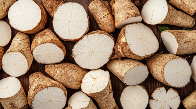 Fresh cassava roots cut in half displaying white starchy flesh