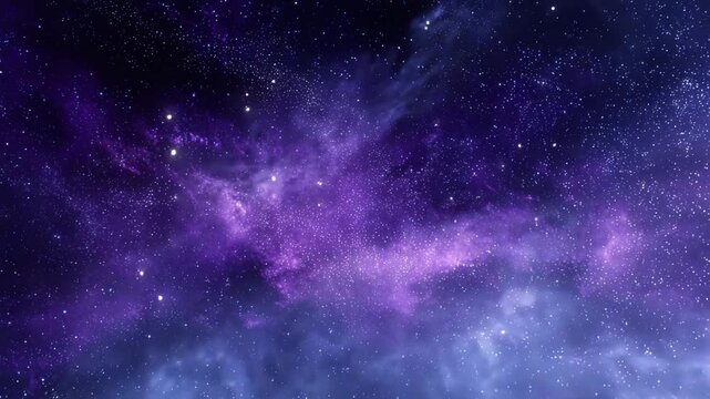 Glittering starfield with shimmering purple nebula clouds and radiant cosmic dust glowing across a black space sky,