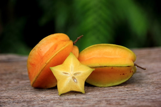 Carambola or star apple ( starfruit ) on old wooden background,Close up healthy carambola or star apple food .