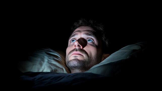 Sleepless stressful man in bed, staring at the ceiling in the dark, struggling with insomnia.