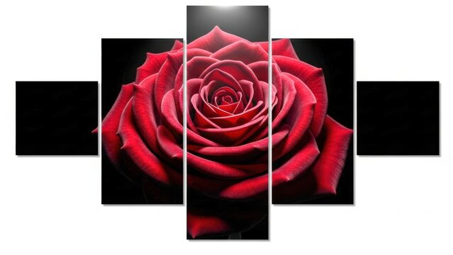 Dramatic close up of a vibrant red rose in bloom against a stark black background