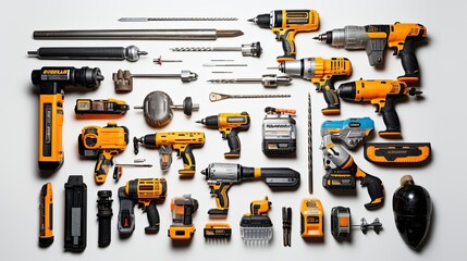 Photograph of a neatly arranged collection of power tools, each showcasing its unique design and functionality, set against a stark white background