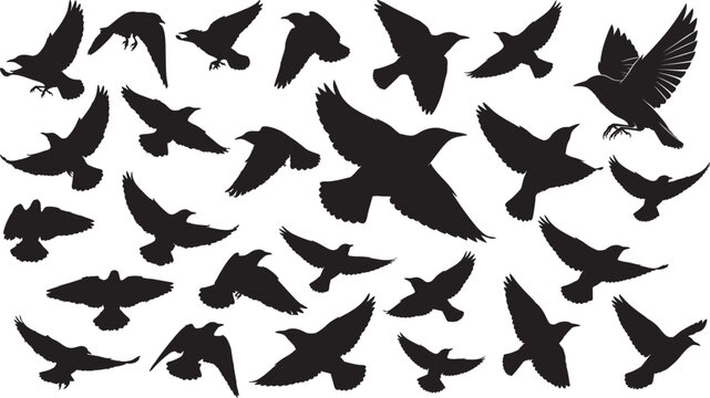 Common starling bird silhouettes, Flying starlings vector pack, Flock of birds silhouette set, Dynamic starling flight illustrations, Avian silhouettes for nature designs