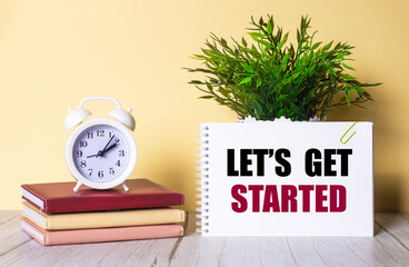 LET’S GET STARTED is written in a notebook next to a green plant and a white alarm clock, which stands on colorful diaries.