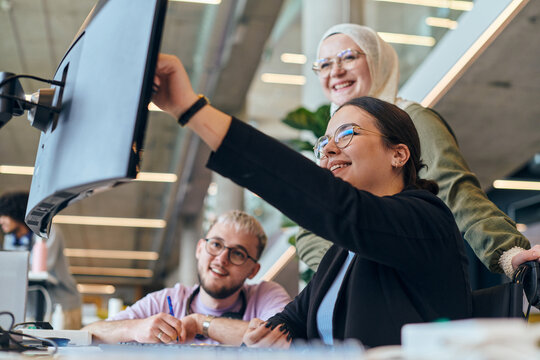 Office laptop, diversity and business people reading online report, website design feedback or research project. Collaboration, staff mentor and team designer working on company homepage development