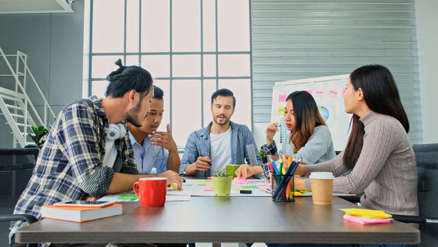 Business meeting at work at trendy startup company presenting pitch for growth and development