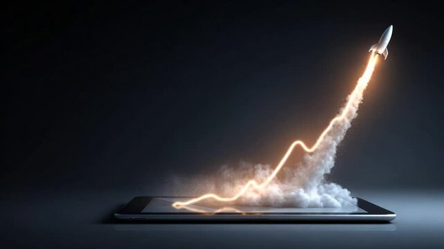 Rocket Launching from Tablet, representing business growth, innovation and technology progress