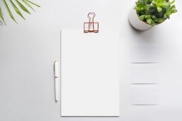 Flatlay with office items and place for text. Layout on a white background. Glasses, keyboard, pen, paper clips, diary, work papers. 4K looped stop motion animation