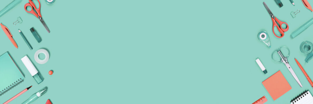 Assorted office and school white orange and green stationery supply on pastel trendy background as knolling. Copy space. Flat lay for back to school or education and craft concept. border banner