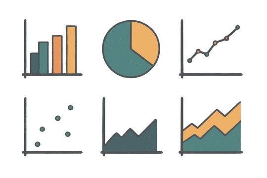 Collection of hand drawn business data visualization charts and graphs for statistical analysis and financial reporting