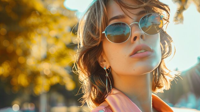 Outdoor portrait of a glamorous woman in sunglasses, looking joyful and realistic