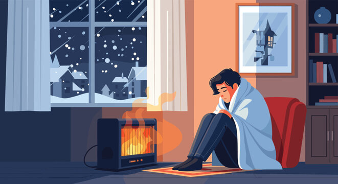 Lonely person wrapped in a blanket sitting by a heater to stay warm during a cold, snowy winter night at home vector art.