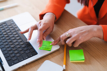 Businesswoman completing checklist on tablet with laptop, managing tasks, staying organized