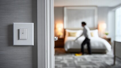 Reception Desk Bell and Reservation Card on Modern Counter in Hotel Lobby Interior with Natural Lighting and Focused View