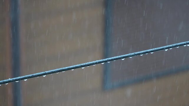 Raindrops cling to a dark wire as steady rainfall blurs the background, forming clear droplets that hang along the line while the soft, muted backdrop highlights the wet atmosphere