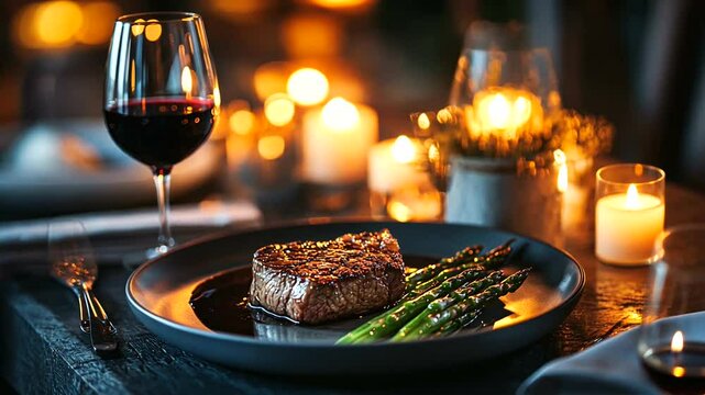 A beautifully lit scene featuring a steak dinner with asparagus, red wine, and candles creating a romantic ambiance for dining