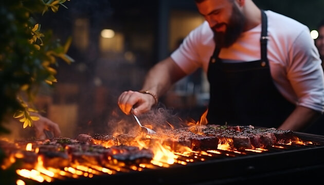 A man cooks a meat steak on charcoal grill. Barbecue party. Steaks cooking over flaming grill