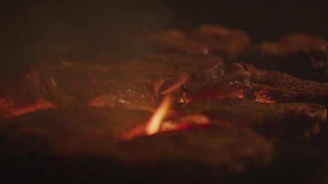 Chef grilling meat with fire flames and smoke on barbecue at night food preparation scene