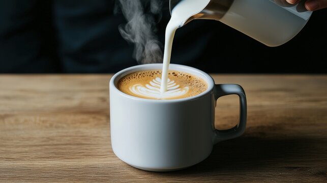 A barista pouring milk into a steaming pitcher, with a focus on the froth and the steam.