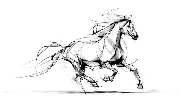 A monochromatic depiction of a galloping steed against a white canvas, framed by a corresponding linear illustration
