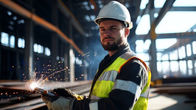 A portrait of a steelworker in a hard hat and reflective vest, holding a welding torch and looking at the camera, with steel beams being assembled in the background