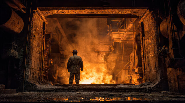 Molten metal steelworker foundry industrial furnace fire heat sparks factory hazard. Lone worker faces blazing furnace gritty foundry