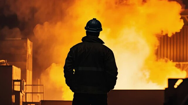 Steelworker's Gaze: A silhouette of a steelworker in protective gear stands before a fiery furnace in an industrial setting, evoking the heat and power of industry.