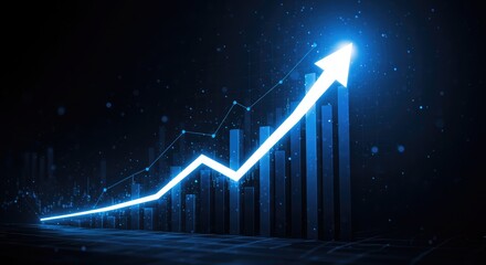A glowing blue arrow chart shows a steep upward trend against a dark, abstract background with subtle bokeh effects.
