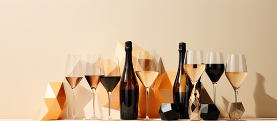 champagne glasses made of grey-tinted glass, along with a bottle of champagne or sparkling wine, set