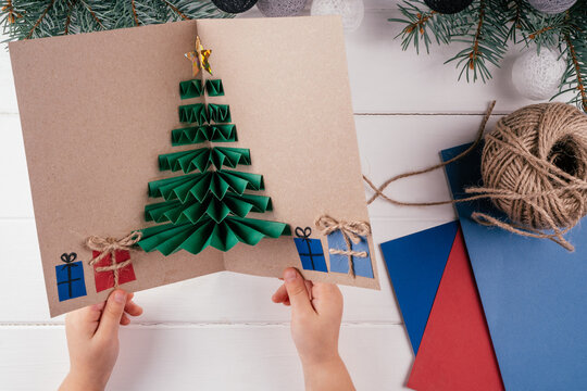 Christmas tree handmade paper toy in a hands on a wooden table. Top view.