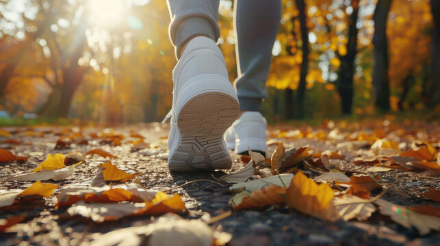A person walks through a park covered in fallen leaves during a sunny autumn day. The focus is on their white sneakers as they step over the colorful leaves