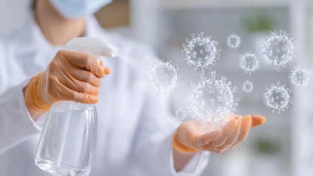 Hands Holding Sanitizer and Virus: A person in protective gear sprays sanitizer towards an array of virus particles, symbolizing disinfection and hygiene in a clinical setting.