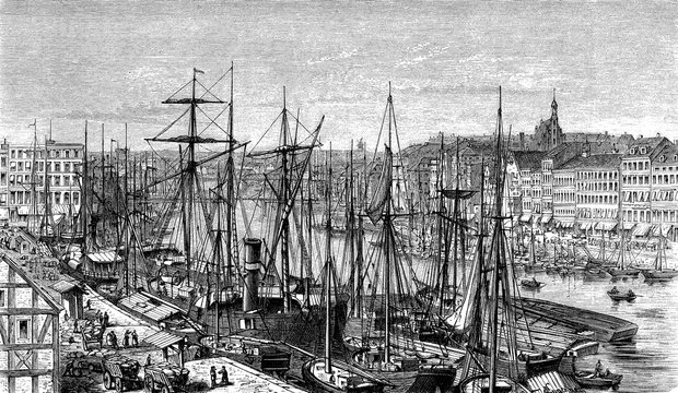 Panoramic view of Stettin (now Szczecin, Poland) harbor on the Baltic coast with sailships moored and cityscape, 19th century
