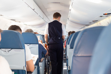 A male steward who distributes food and drinks on board the aircraft. The passengers are sitting in their seats and watching. View along the row. High quality photo