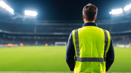 Steward overseeing safety at a nighttime soccer match from behind