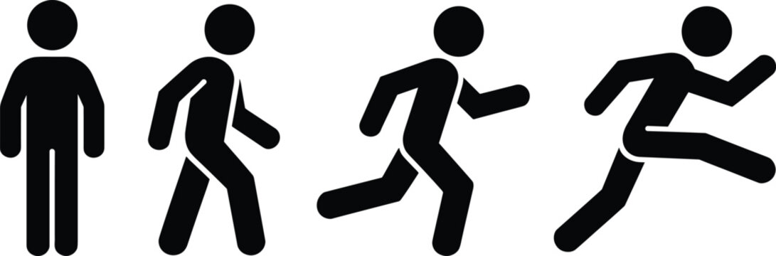 Four black stick figure icons illustrating progression from standing to running motion silhouette human