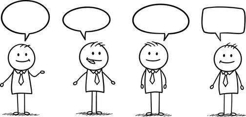 Three stickman characters in discussion with speech bubbles in minimal hand drawn cartoon setting