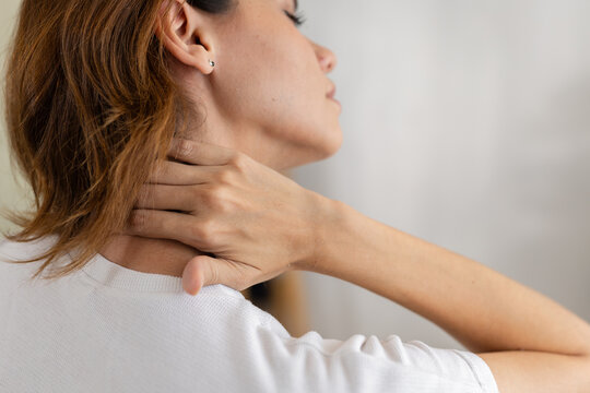 Close up rear view of woman touching her neck in pain, showing muscle tension or stiffness. Concept of neck pain, poor posture, stress, or office syndrome in daily life.