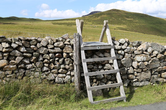 A closeup view of a wooden stile over a dry stone wall in Gwynedd, Wales, UK.