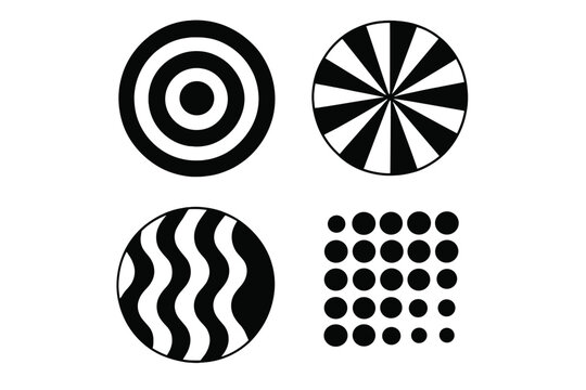 Set of abstract geometric black and white circle patterns. Collection of minimalist shapes for modern design. High contrast vector icons for visual stimulation and op art.