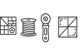 Quilting tools icons: patterns, thread, rotary cutter, and quilted patch vector icon illustration