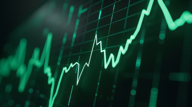 Close-up of a glowing green financial chart displaying market fluctuations and stock trends, representing business and finance concepts. Abstract blur background.