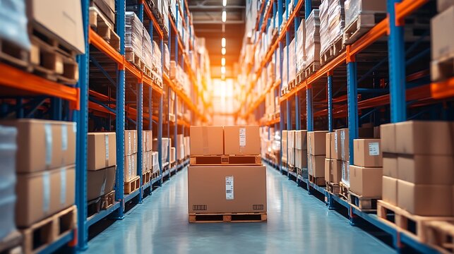 Warehouse and inventory schedule management concept. Smart shelves with automated stock tracking sensors, inventory technology, automation
