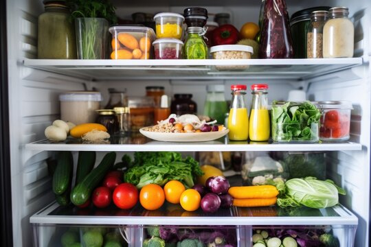A well-organized refrigerator neatly stocked with medicines and organic produce, blending health and nourishment in orderly harmony.