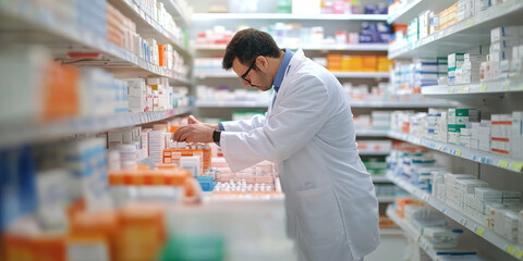 Pharmacist organizing medications in a modern pharmacy, creating a professional atmosphere. The shelves are stocked with pills, reflecting a commitment to health