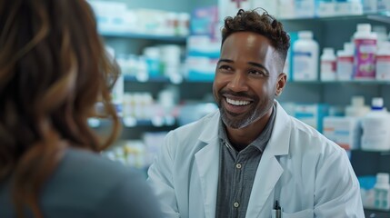 A friendly Black male pharmacist in a white coat smiles warmly while consulting with a female customer. The pharmacy shelves are stocked with medications in the background, creating a professional and