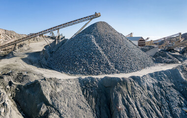 Huge pile of gravel and machinery at stone crushing and screening plant, over blue sky